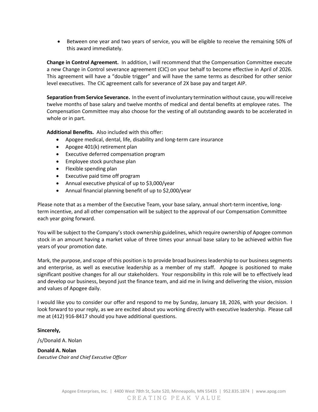 5, 2025, and incorporated herein by reference) (the “Performance Bonus”). The actual award is subject to Board or the Compensation Committee of the Board discretion, to be exercised depending on Mr. Nolan’s achievement of certain performance goals and business objectives (“CEO Performance Goals”), to be approved by the Board in the fourth quarter of fiscal 2026 and paid upon the expiration of the Term. On January 15, 2026, the Board approved Mr. Nolan’s CEO Performance Goals, which are based on strategic and financial targets, customer focus, filling of key positions, and to drive alignment, efficiency and cost savings.
