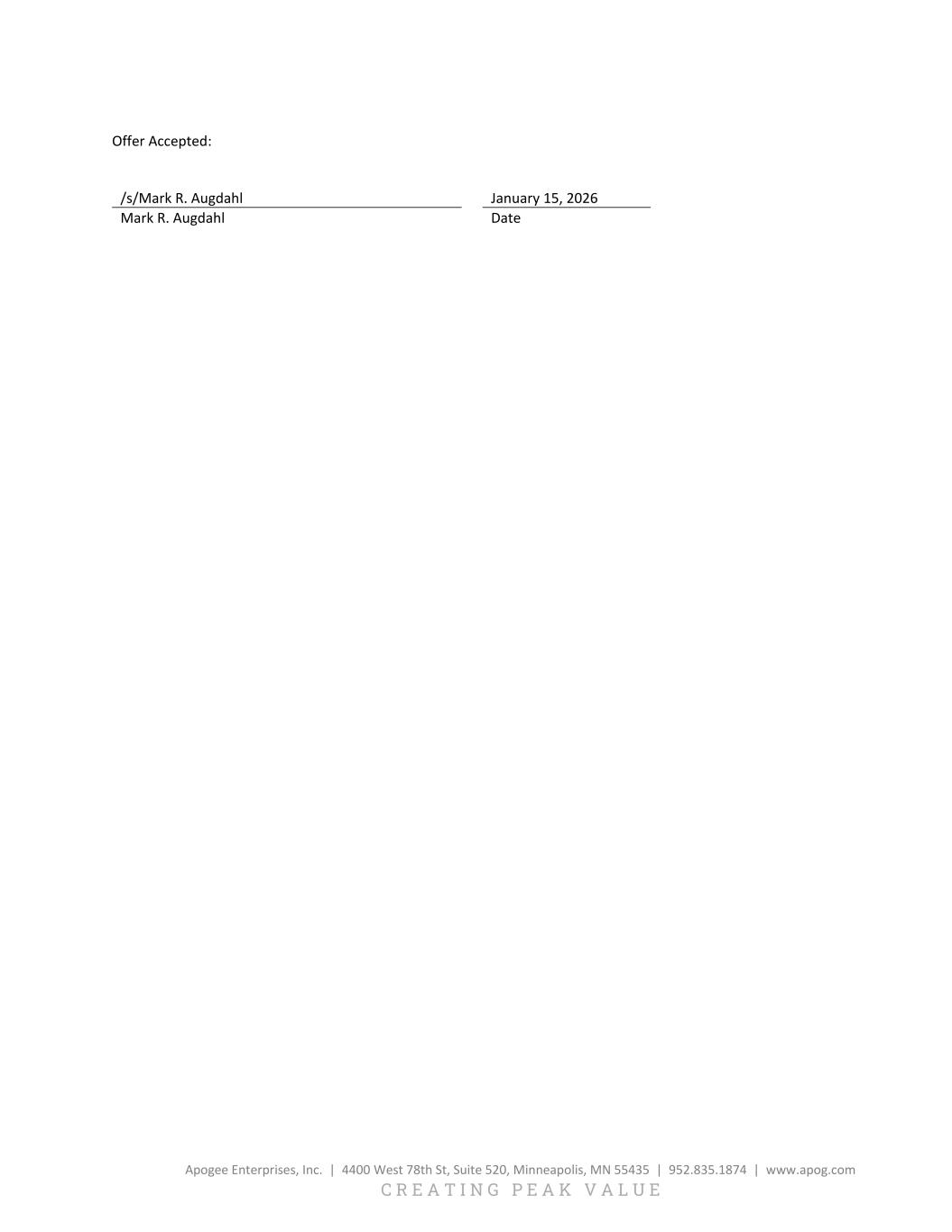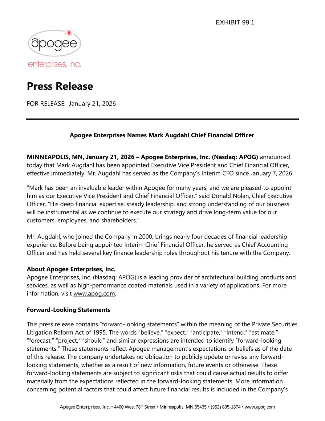 On January 21, 2026, Apogee Enterprises, Inc., (the “Company”) announced that Mark R. Augdahl, 60, was promoted from interim Chief Financial Officer to the Company’s Executive Vice President and Chief Financial Officer effective January 19, 2026. Mr. Augdahl previously served as the Company’s Chief Accounting Officer.