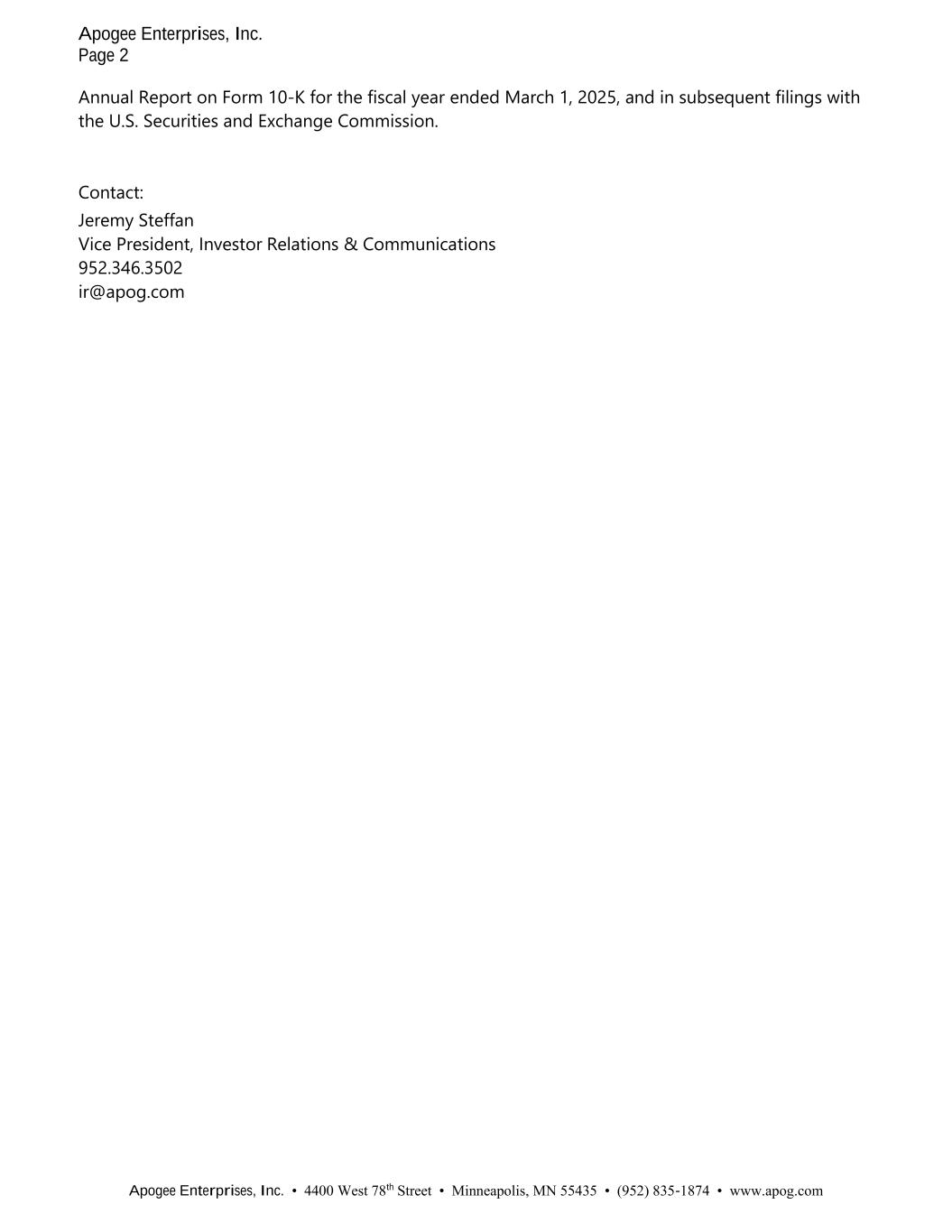 APOGEE ENTERPRISES, INC.